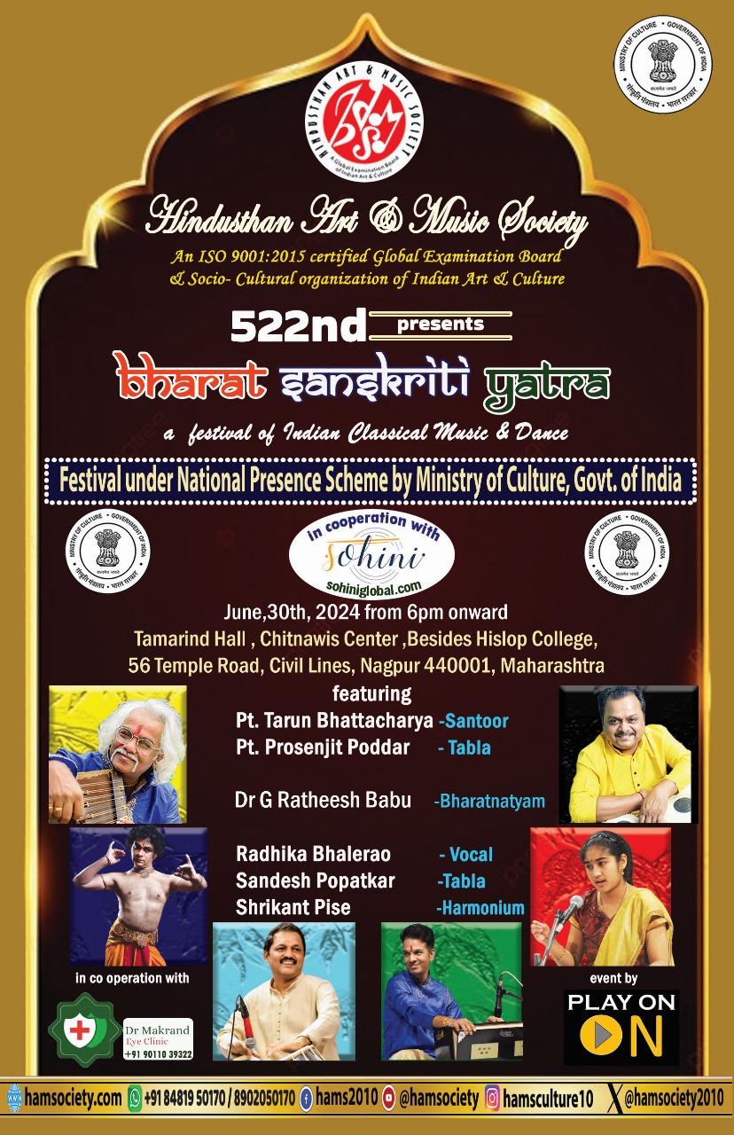 पंडित तरुण भट्टाचार्य आणि पंडित प्रसनजित पोद्दार ह्यांचे सुश्राव्य वादनाचे कार्यक्रम —————————————————- रसिकांच्या रसास्वादासाठी जून २९ ला अमरावती येथे आणि जून ३० ला नागपूर येथे असे शास्त्रीय संगीताचे दोन कार्यक्रम घेऊन येत आहोत. संगीत नाटक अकादमी पुरस्कृत , विख्यात संतूर वादक पंडित तरुण भट्टाचार्य ह्यांचे संतूर वादन आणि पंडित प्रसनजीत पोद्दार ह्यांची तबल्यावर संगत हे हया कार्यक्रमाचे प्रमुख आकर्षण ठरणार आहे . संतूर हे प्राचीन वाद्य शततंत्री वीणा म्हणून देखिल ओळखले जाते . त्याचा सुमधुर स्वर हा श्रुतींना मोहून टाकणारा आहे. पंडित तरुण भट्टाचार्य हे सतारसम्राट भारतरत्न पंडित रविशंकर ह्यांचे प्रमुख शिष्य आहेत. पंडितजी ठेकाप्रधान वादनशैलीचा मुख्यत्वाने वापर करत असल्यामुळे , त्यांचे कार्यक्रम श्रोत्याना मंत्रमुग्ध करतात . तरी सर्व रसिकांनी दोनही कार्यक्रमांचा रसास्वाद घ्यावा ही विनंती June 29, Veer Sawarkar Hall , Amravati, 6 pm onward June 30 , Chitnawis kendra, Tamarind Hall, Nagpur 6 pm onward ह्या कार्यक्रमाचे आयोजन Ministry of Culture, भारत संस्कृति उत्सव आणि सोहिनी कॉर्पोरेशन तर्फे करण्यात येत आहे . इतर मान्यवर कलाकार देखिल ह्या कार्यक्रमात आपली कला सादर करतील. त्या मान्यवर कलाकारांची नावे थोड्याच दिवसात उदघोषित करण्यात येतील.